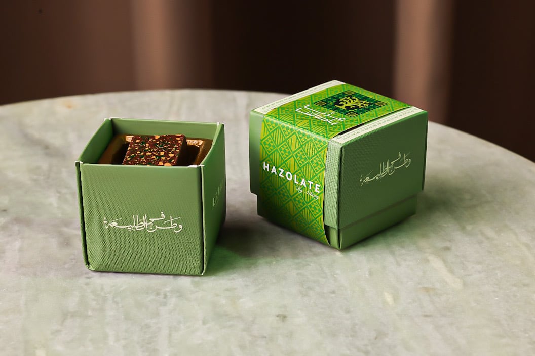 بوكس أنيق يحتوي على قطعة شوكولاتة فاخرة بوزن 12غ بتصميم مختلف يحمل كلمة "وطن في الطليعة". خيار مثالي للتوزيعات المميزة والعملية في المناسبات الوطنية والخاصة